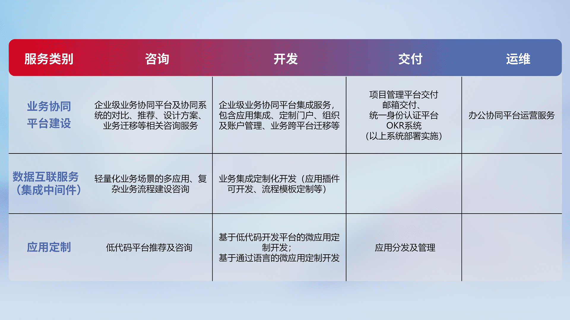 针对钉钉、、、企微、、、IDaas等平台级产品提供产品的规划、、、、方案、、交付、、、、定制化开发等服务,,,,实现如统一协同办公、、智能客户服务、、、混合会议管理、、、智能数据查询、、、等业务场景,,,,实现数字化转型。。。